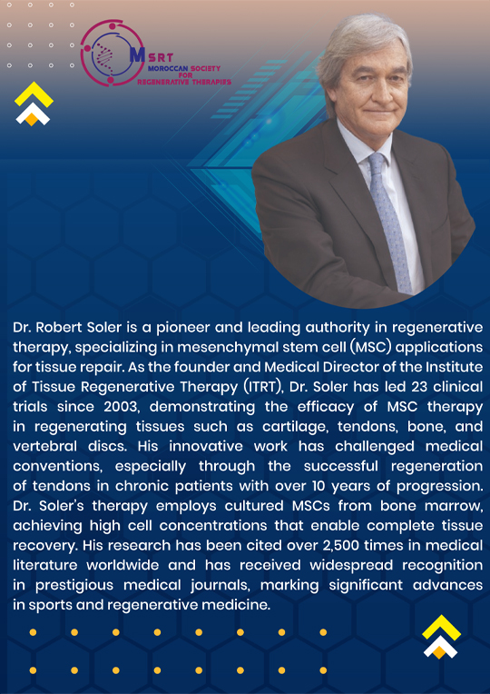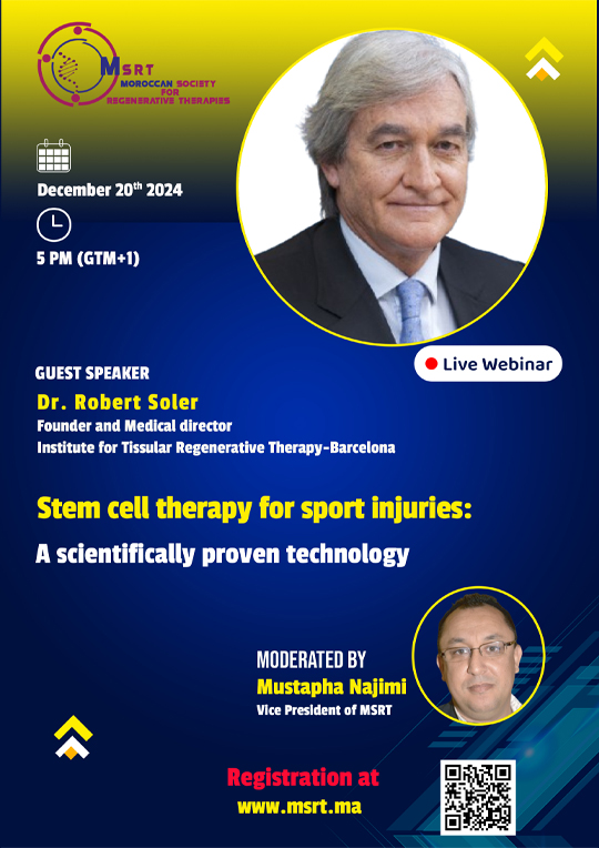 The Moroccan Society for Regenerative Therapies (MSRT) is delighted to invite you to its upcoming webinar titled: “Stem Cell Therapy for Sport Injuries: A Scientifically Proven Technology”, presented by Dr. Robert Soler.